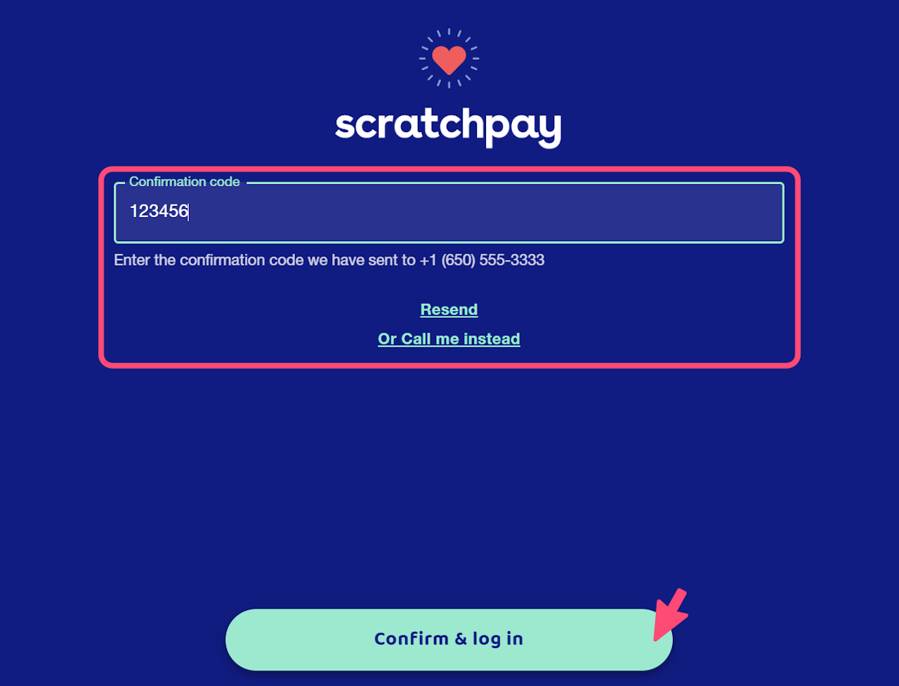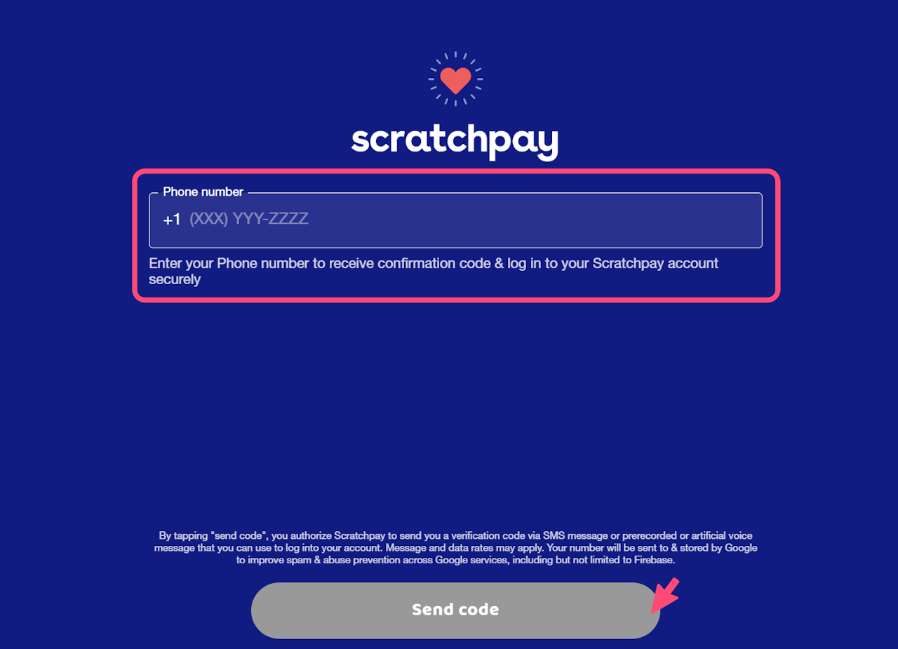 Navigate to https://account.scratchpay.com/login or locate your Scratchpay Plan App on your iPhone or Android device. Start by entering the phone number associated with your Scratch Pay plan and select Send Code. The system will send you an authentication code directly to your mobile phone, needed to securely access your account.