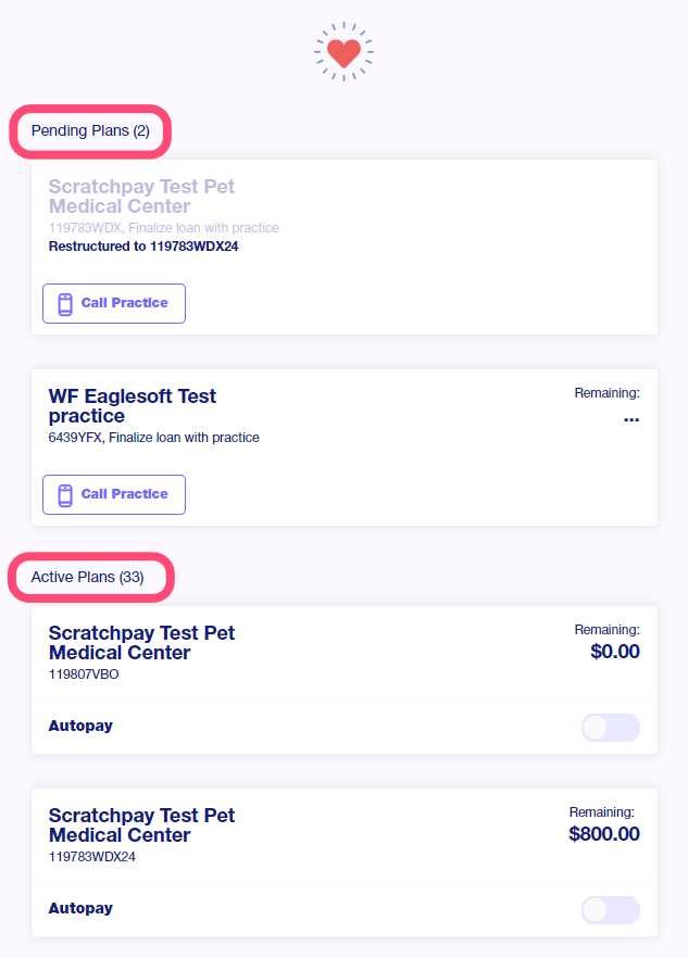 Navigate to the Borrower Portal, or access your account through the Scratchpay Plans App on your iPhone or Android device. Once logged in your home screen will display Pending, Active and Paid-Off Scratch Pay plans. Alternatively, access the portal menu and then navigate to My Loans.