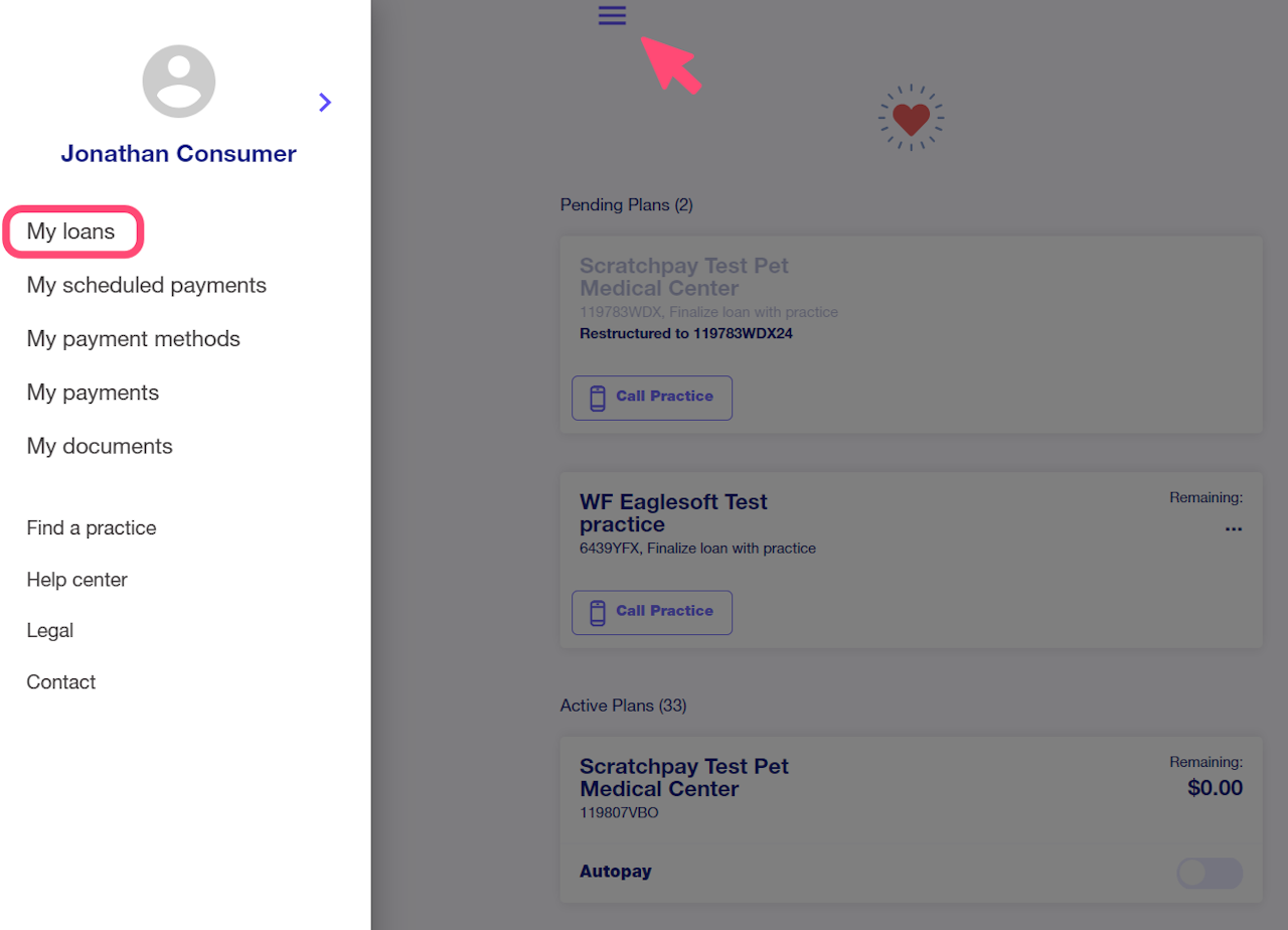 Navigate to the Borrower Portal, or access your account through the Scratchpay Plans App on your iPhone or Android device. Once logged in your home screen will display Pending, Active and Paid-Off Scratch Pay plans. Alternatively, access the portal menu and then navigate to My Loans.